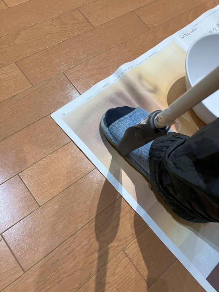 次に両面テープをはがしたところに、専用溶液を吹きかけます。その際、周りにスプレーが飛び散らないように下に新聞紙を敷いて、たらいを下においてスプレーを両面テープ部分に吹きかけます。