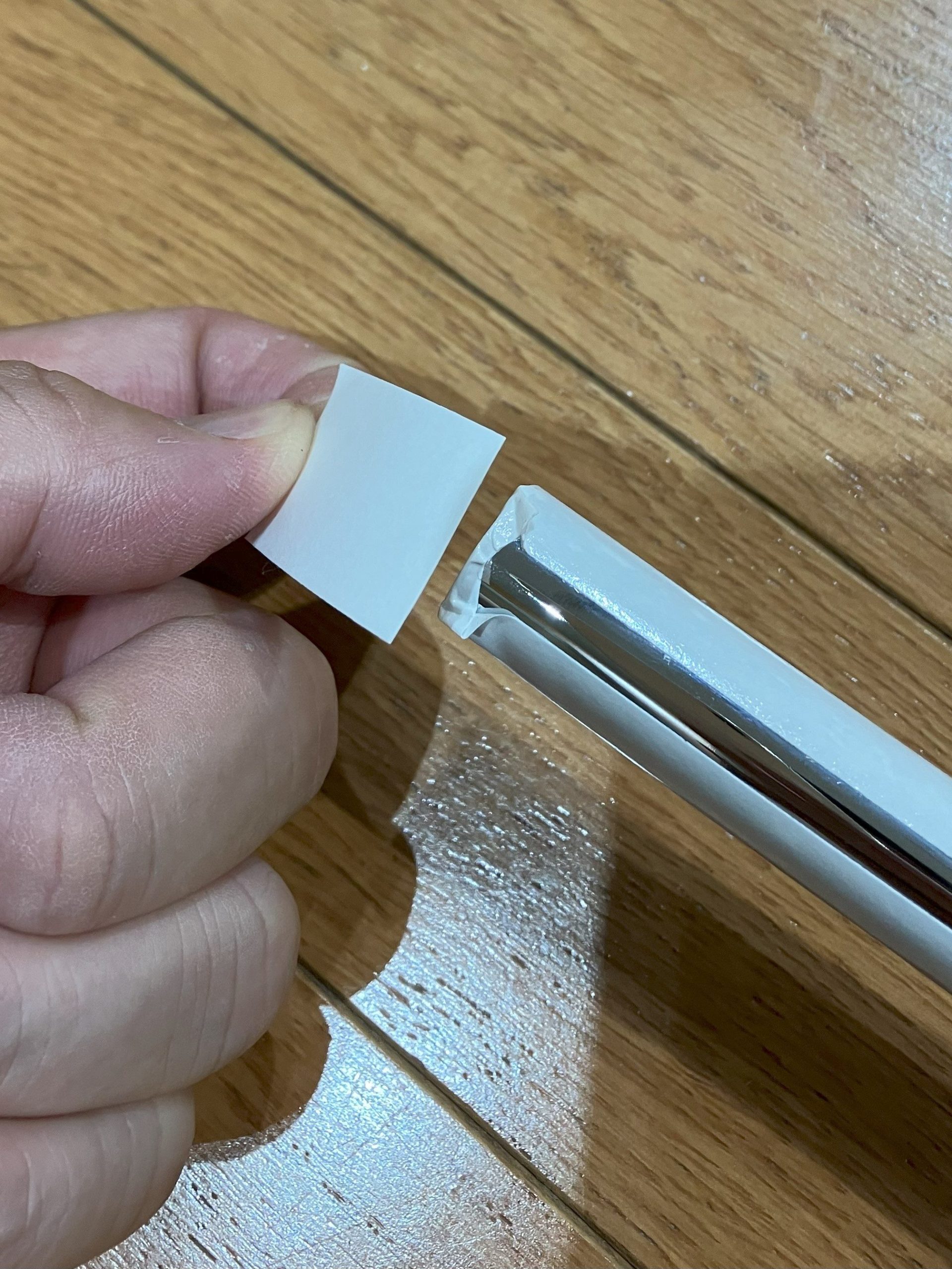 次に両面テープをはがします。グリップエンド部分には穴があいているので、そこから水が入るとシャフトが錆びることがあるため、以下のように両面テープで補強しておきます。