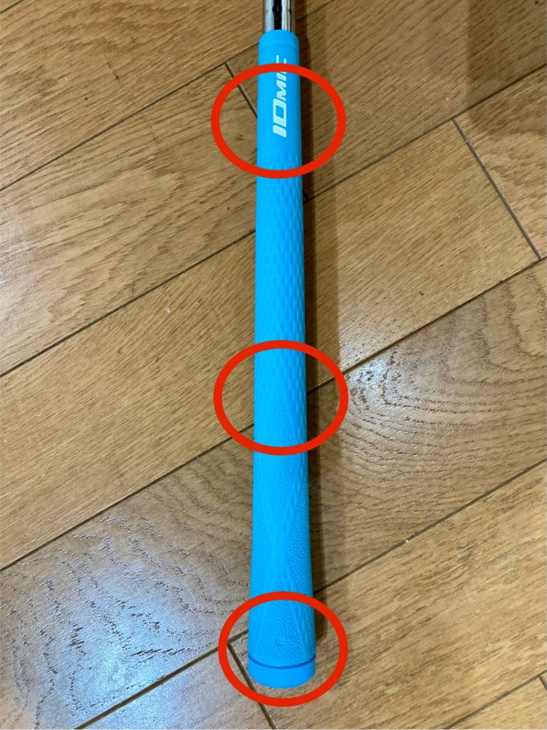 下記写真の赤丸部分にあるマークや模様が一直線になるように揃えます。また、アドレス時の構えをとって、バックラインが自分の指のどこにあるか確認して微調整をします。溶液を塗布して、約10分ぐらいは簡単にグリップを回すことができ、グリップの向きを変えることができます。